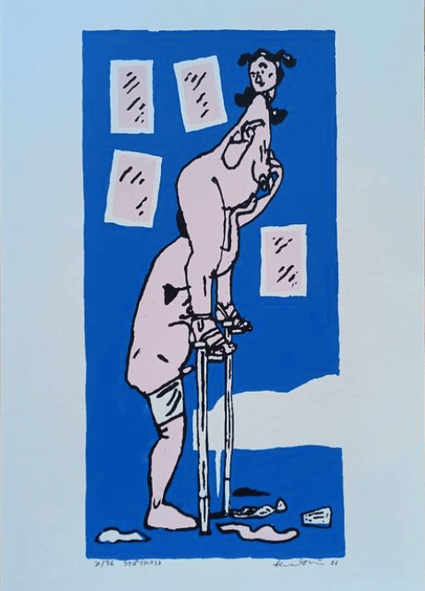 Trykt i hånden af kunstneren i tre farver på tykt 300 gr A3 akvarelpapir. 2021. Signeret og nummeret 1-36. Motivet er fra udgivelsen "Højt Humør" (2021). Da motivet er håndtrykt, kan de enkelte tryk variere en anelse. Prisen er for løst tryk uden ramme.